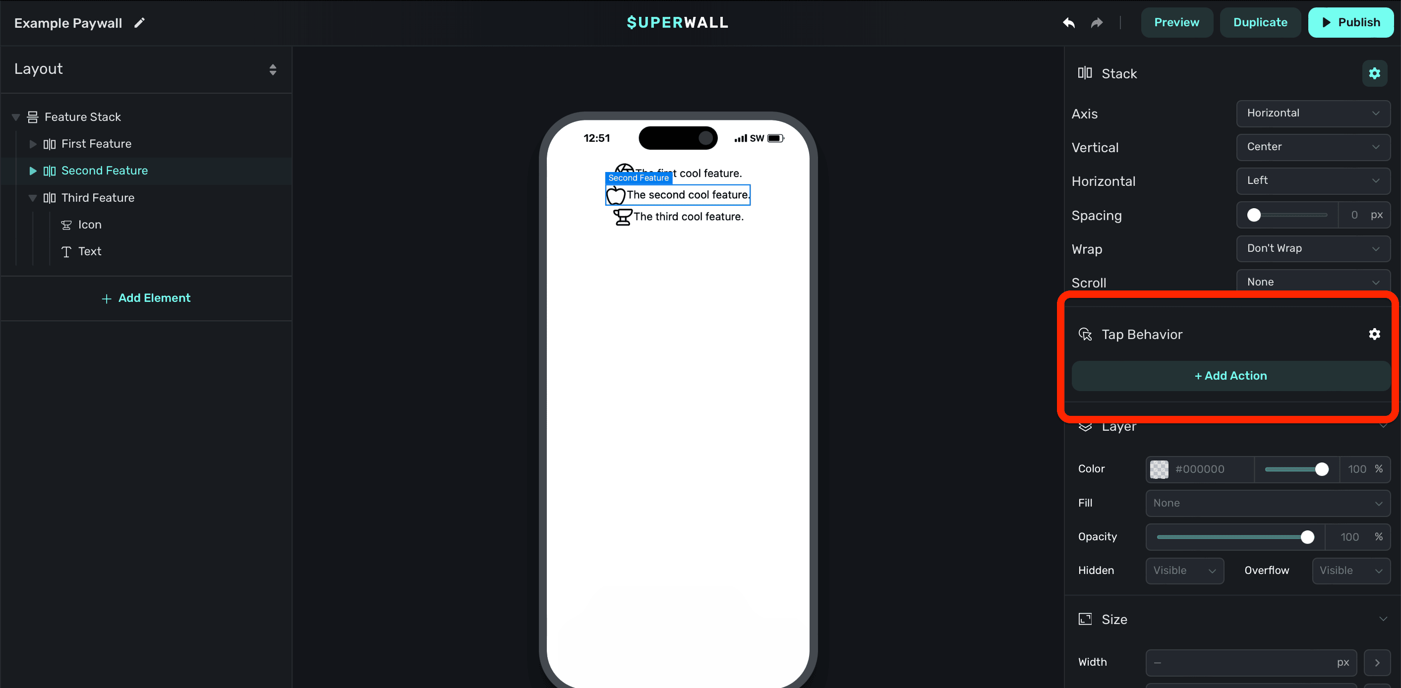 You can have a component trigger a specific action when it's tapped or clicked by adding a tap behavior. To add a tap behavior, click a component from either the Layout tab or the preview canvas, and in the component editor under under Tap Behavior click + Add Action: